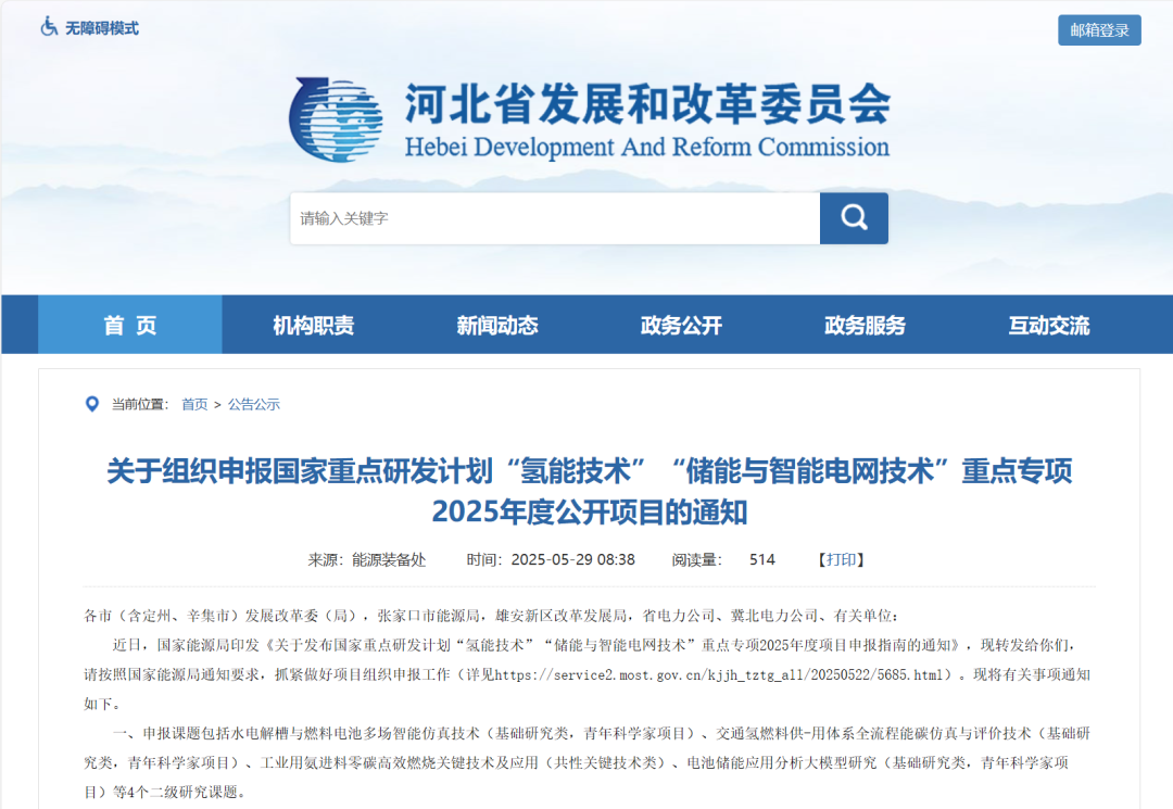 5月26日,河北省发展和改革委员会发布关于组织申报国家重点研发计划“氢能技术”“储能与智能电网技术”重点专项2025年度公开项目的通知,称申报课题包括水电解槽与燃料电池多场智能仿真技术(基础研究类,青年科学家项目)、交通氢燃料供-用体系全流程能碳仿真与评价技术(基础研究类,青年科学家项目)、工业用氨进料零碳高效燃烧关键技术及应用(共性关键技术类)、电池储能应用分析大模型研究(基础研究类,青年科学家项目)等4个二级研究课题。申报单位同一个项目只能通过单个推荐单位申报,不得多头申报和重复申报。