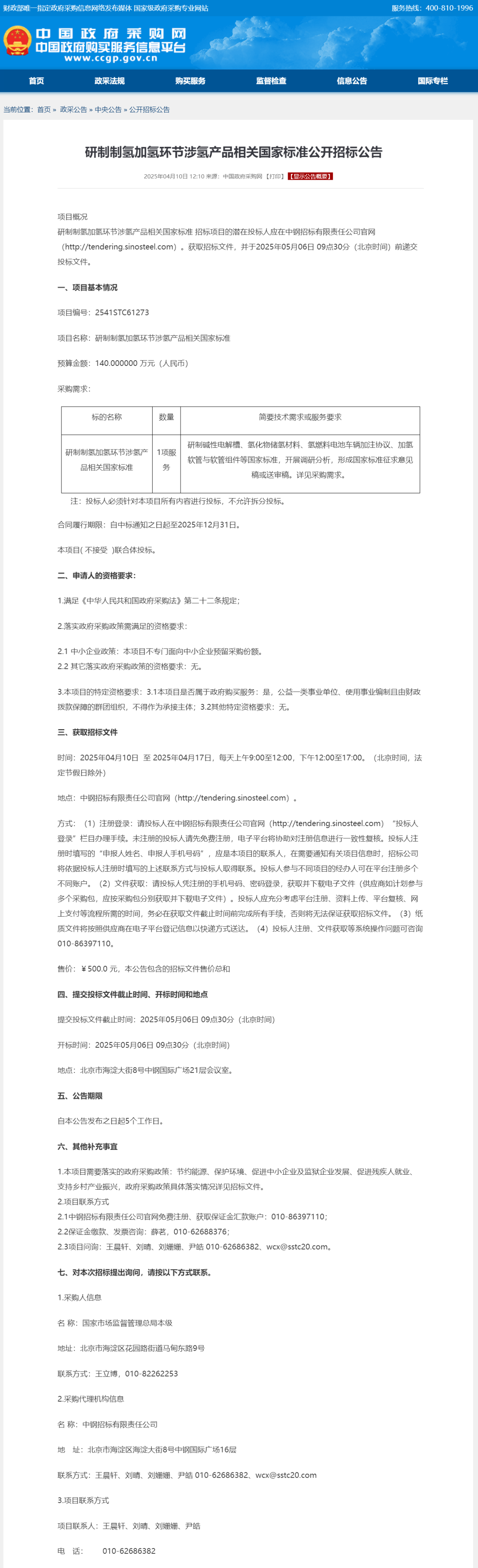 4月10日,国家市场监督管理总局就研制制氢加氢环节涉氢产品相关国家标准进行公开招标。公告显示,要求研制碱性电解槽、氢化物储氢材料、氢燃料电池车辆加注协议、加氢软管与软管组件等国家标准,开展调研分析,形成国家标准征求意见稿或送审稿。
