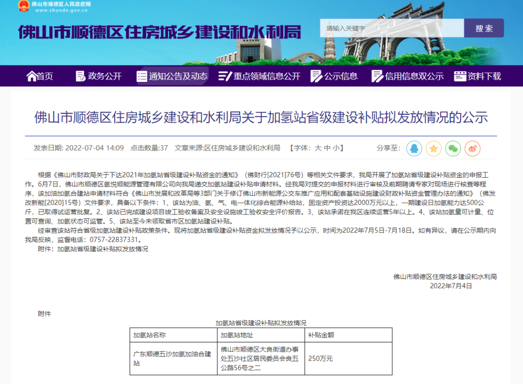 佛山市顺德区住房城乡建设和水利局发布关于加氢站省级建设补贴拟发放情况的公示